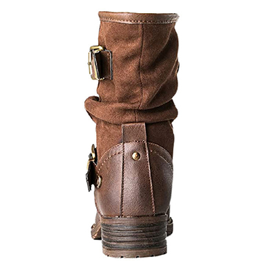 You are going to love the rustic look you can create whenever you have boots like these available to you. The use of a combination of suede and grain leather makes sure that you are going to have a unique look. Two straps are attached on the outside and across the front of the bridge of the foot. These straps span across the split in the side to make sure that once you have slipped your foot inside that you can adjust the fit to suit your needs. Grain leather straps as well as metal buckles help to enhance the look. Accent rivet on the heel cap make sure that you are getting the look you desire. The stacked soles include rubber tread on the base as well as a low heel to make sure that you are getting the rustic look you are going for.