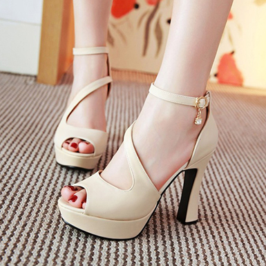 You will simply fall in love with these incredible high heels. They are made of an ivory colored material. The top of the shoes have a panel which has a peep toe style cut. A large angled cutout has been placed in the middle area of the panel. A larger angled cutout has been placed art the top ares of the shoe. The heel back has a rounded cut. An ankle strap has been attached to the top of the heel area. A small gold metal buckle closure has been placed on this strap. A small dangling chain charm has been placed on the buckle. The heel have a tall block stiletto style.