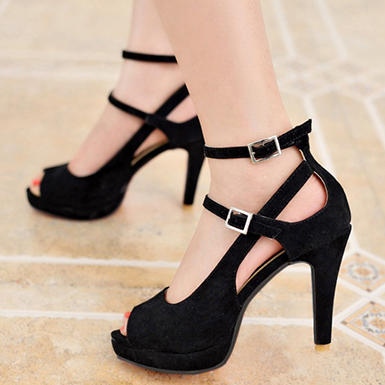 This shoe doubles down on the stylishness it offers you. These are the best black shoes to wear when you need to step out on confidence. They are are made of a high quality black quality material. The sole under the toe area is a mini platform design. The pointed toe box has a peep toe construction. The upper sides have long cutouts. The heel has a chunky, tapered block style. An ankle strap has been added to the lower area of the heel back. Another ankle strap has been added to the upper area of the heel back. These double ankle straps have silver buckles. These are the dress heels you need to have in your closet at the ready for any semi-formal or formal occasion.