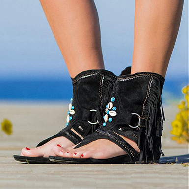 When it gets hot outside this summer, you??re going to love having sandals like these available for you to enjoy wearing. The overall style of the sandals will remind you of sandals which have been worn by the Native Americans for centuries. Rough leather is used throughout to give these sandals the appearance of something made by hand. Beads are attached to the front of the ankle in a floral pattern to add to the overall appearance of the sandals. Tassels are attached to the sides of the ankles and will move when you move to add to the style of the sandals. Thong style includes a leather strap that wedges between the first two toes. High ankle connection means your legs will be protected when you are walking off the beaten path. Rounded sole and heel platforms maintains the comfort and location of your feet.